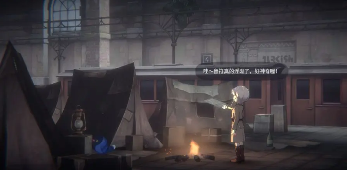 这样在月台的椅子上能发现一本书,把书交给迪西特能得到乐谱,和兰对话会得到一张空白乐谱,根据提示去找到纽顿对话,根据他话里的内容,去月台最左侧的火堆处,点击火堆,就能让空白乐谱浮现字样。