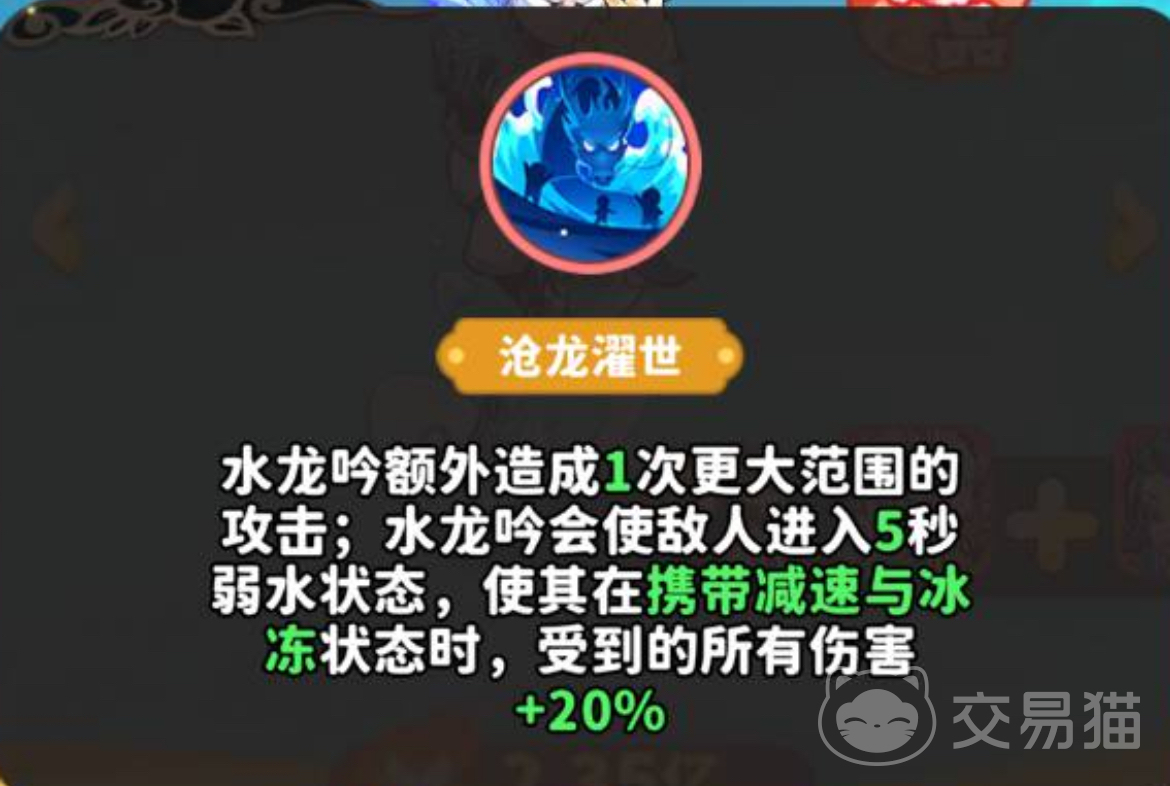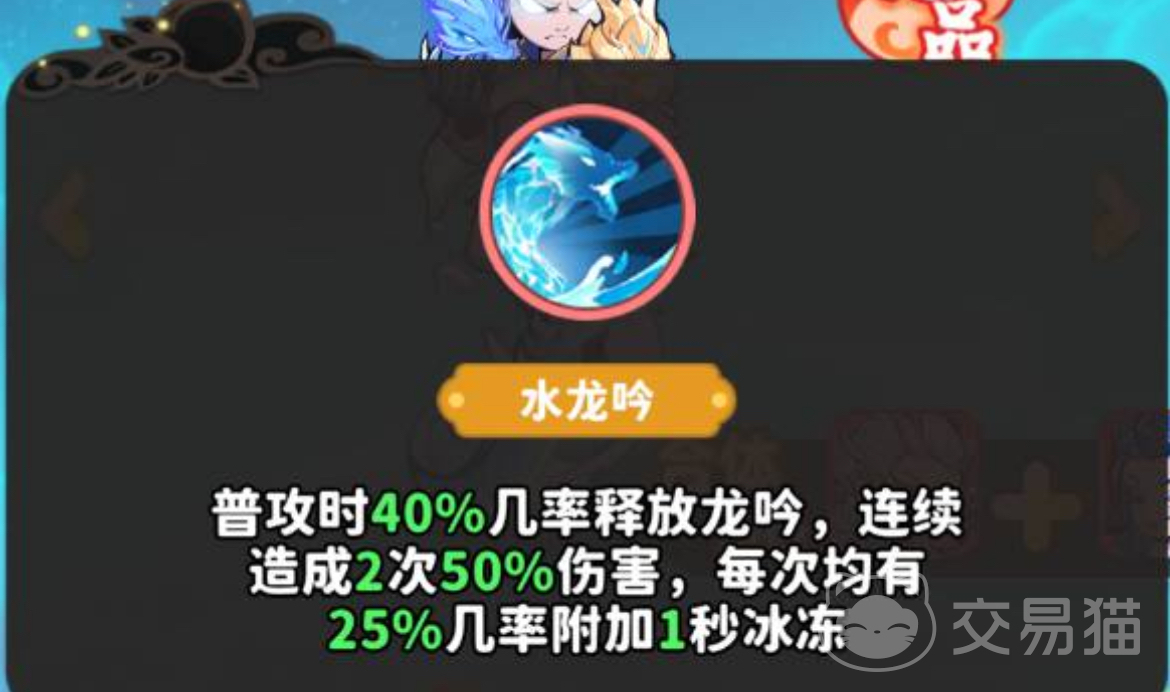 水龙吟的普攻有40%的概率能触发两段连续伤害,且每段有25%概率附带冰冻效果。所以该技能不仅可以保持持续输出效果,同时也兼具控场干扰的效果。冰冻可以打断敌人的施法和走位,在参与boss战时可以利用冰冻强制打断boss的核心技能,比如妖王的狂暴连招。虽然比较依赖普攻频率,但是搭配水系阵容的“攻速增益”就可以进一步的提高触发冰冻概率。