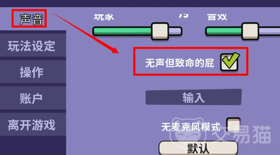 不过也有很多玩家觉得这个放屁的声音太吵了,有没有什么办法能够使其保留功能性的同时没有声音呢?其实也是可以的,小伙伴们打开操作界面,在声音选项中可以看到有一个选项叫。无声但致命的屁,只要把这个勾上,所有的放屁都会失去声音,但是功能性仍然存在。如果担心因为没有声音而影响自己的判断,也可以单纯的把游戏内的所有声音给拉小一点,这样的话不会显得太过刺耳。