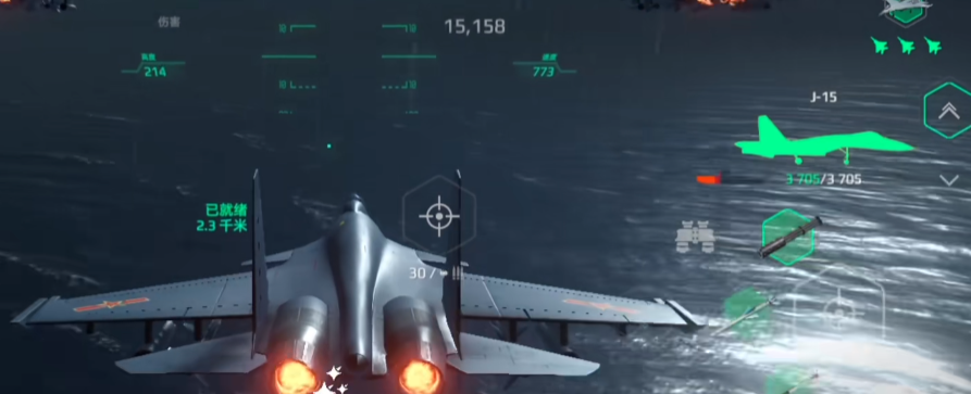 歼-15,极具操作感,31.5万美金售价,虽然耐久仅有3705,偏向“脆皮”类型,但极速高达773,在二级房中处于领先位置。其最具杀伤力的是搭载的鹰击-83导弹,该导弹射程5.9公里,双组备弹可实现连续火力压制,单轮伤害达5万,爆发力极强。搭配70mm火箭弹与中俄通用30mm机炮,构成了快速点射、高速拉打的打法核心。实测单轮输出8.9万,满伤输出20万,属于中高水平。这款战机更适合擅长快速游走、规避打击并寻找机会集火的高操作型玩家。