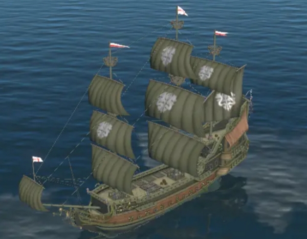 皇家幸运号,标准的强力风帆战舰,以厚重的装甲和密集的火炮数量著称。团队战斗中,往往扮演远程火力压制的核心位置。推荐选择普通炮作为基础武器,发挥装填速度、射速优势,能密集打击敌方船队。
