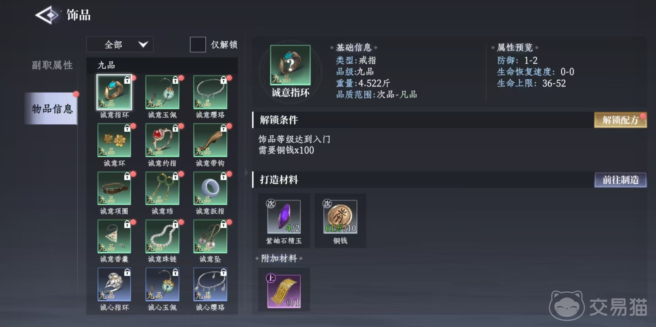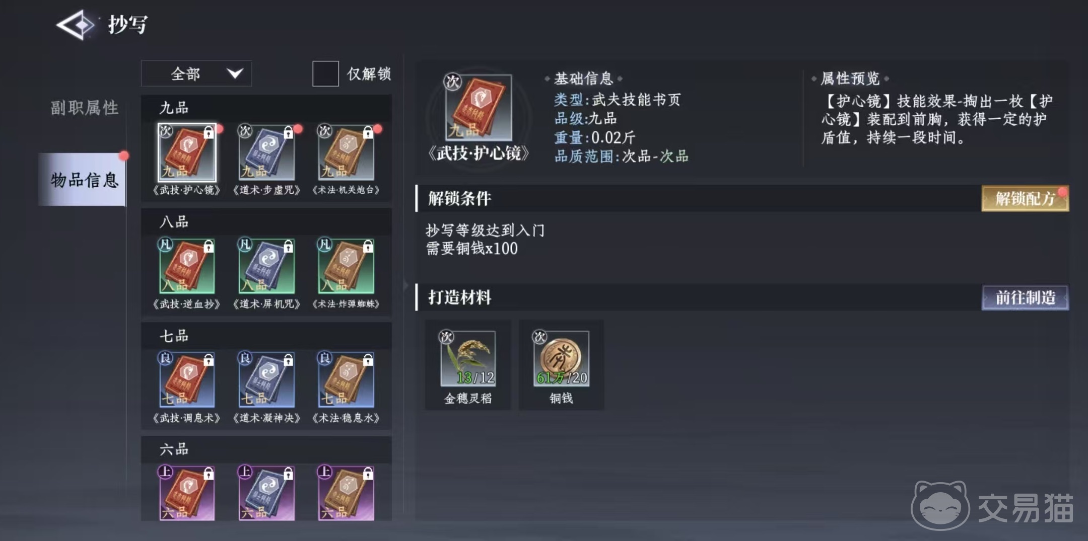 大家打开游戏的功能菜单之后,可以直接看到副职业的选项,游戏里的副职业主要分为两类,分别是采集和锻造。采集类型的副职业就包括挖矿、采玉、割草、采药、钓鱼、狩猎和种植。锻造副职业包括锻兵、铸甲、饰品、抄写、炼丹和烹饪。这两类职业其实很好理解,锻造类职业所需要的材料,都是由采集类所提供的。