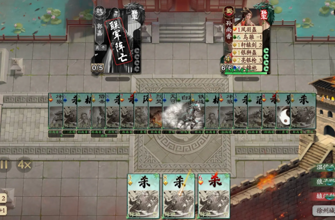 孙尚香和甘宁的强度也是比较强势的,其中甘宁的百人夜袭需要绑定黑桃牌才能够触发拆牌效果,在操作的时候大家可以先用二技能将手里的牌全变黑桃,重新洗牌再摸。孙尚香满血时装备的收益是比较大的,所以大家开局的时候,先装装备。