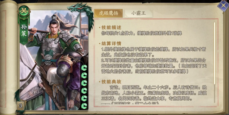 首推的武将是孙策和周瑜,孙策的核心玩法就在于卖血换牌,每损失一点体力值就可以多摸一张牌,抽到好牌的概率比较大。当手牌数是全场最高的时候,弃牌阶段大家能够发动二技能额外打一次决斗。