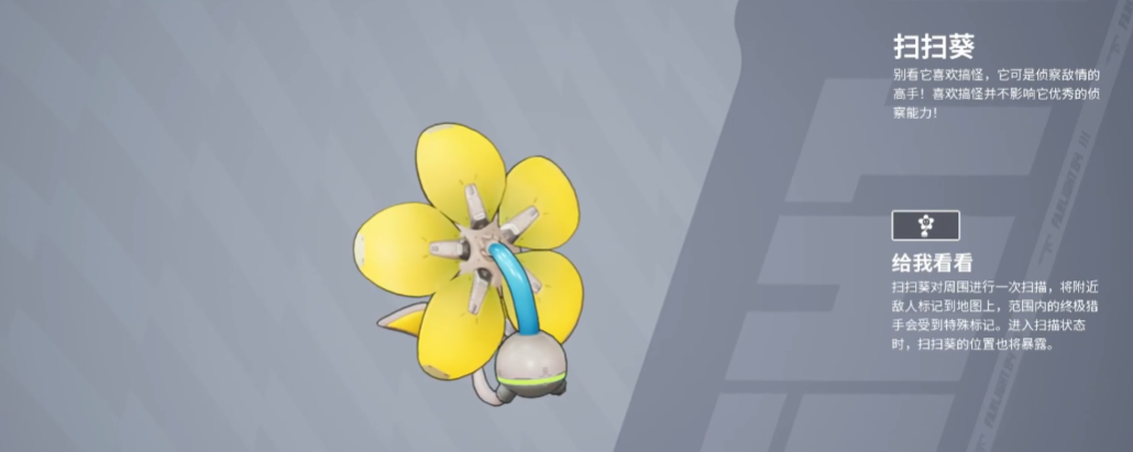 它的能力是对周围展开一次扫描,直接将附近扫描的敌人标记到地图当中,范围内的终极猎手还会受到特殊标记,不过需要注意,处于扫描状态时,它自己的位置也会暴露。它实际能扫描的范围非常的大,基本是涵盖了整个小地图的所有敌方目标的,对比有角色获取能力的英雄就能知道,魅影之类的,她们的探测范围也就50米左右,多人的队伍处于一片区域时,就很容易有遗漏,而扫扫葵的覆盖范围就起到作用了,也可以和部分英雄的招式组合使用,效果会更好。