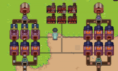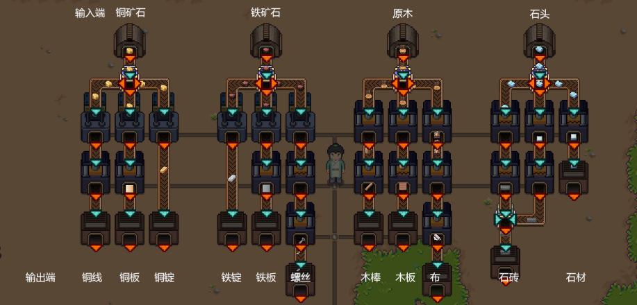 原木的3条线,一条产出布、一条产出木板,一条可以再用木材来制作木棒,铁矿石3条线,两条连接制造机的分别产出铁板和螺丝,铁锭不加工的原因的是因为前期用处很多,可以线存着,铜矿石的3条线连接制造机的分别制作铜板和铜线,铜锭不加工的原因和铁锭相同。
