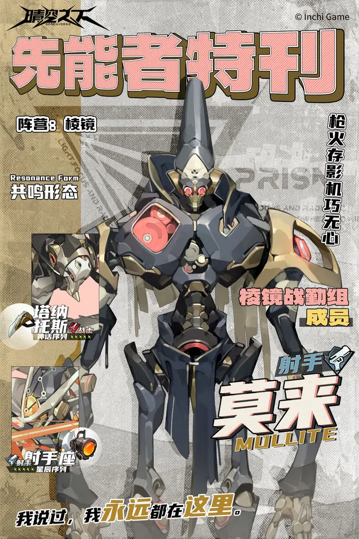 莫来是棱镜阵营的先能者,也是曾经战争中幸存下来的战斗型CIFA,经过改造后,他更加适应目前的环境。是精准射击的射手定位角色,擅长对敌方群体进行打击。1技能施展,他对敌方发射掌中炮,让敌方受到大程度损伤,如果敌方单位已经被“锁定”,此次伤害提升。2技能让他能随时计算战场的态势,并及时调整战术,如果他处于相对危险的区域,就会增加自身的射程,反过来,处于安全的位置,则会提高自己的移动力。3技能让他拥有强大的索敌能力,每回合结束都能让被锁定的目标承受固定损伤。