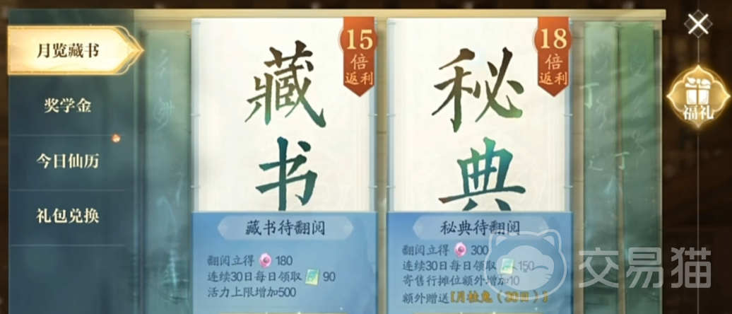 首充福利就是第一个氪金点,也是比较便宜的项目,首充最低是6元,首次充值就能获得特殊道具”合欢铃”,这个道具可用来提升角色实力,微氪朋友可以考虑。第二个点”月览藏书”,其实可以理解为该游戏的月卡,分为18元和30元两个档次,30元档的还有额外的月桂兔赠送,能从中获得更多的货币以及培养资源。