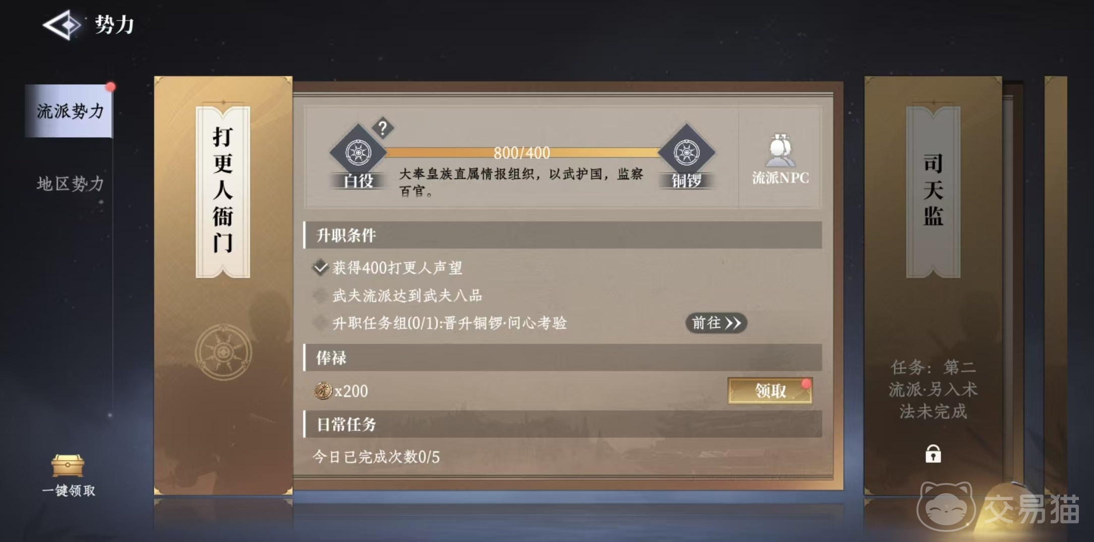 在前期玩家加入的第1个势力就是打更人衙门,在完成了任务第二流派另入术法之后,可以加入到司天监。完成任务,第二流派另入道门之后,可以加入灵宝观。地区势力也有自己对应的加入任务,例如龙隐会需要完成任务蛟龙隐兮,天香阁需要完成任务牡丹馥郁,百物坊需要完成任务追凶缉影。流派势力和地区势力对应的玩法和奖励是不同的,流派势力以打更人衙门为例,每天可以完成对应的日常,然后不断累积贡献晋升。玩家一开始是属于白役,后续可以升到铜锣。然后在流派npc这里可以学习到技能,在商人处进行道具兑换等。只要达到要求就可以晋升,每天还可以领取到俸禄。