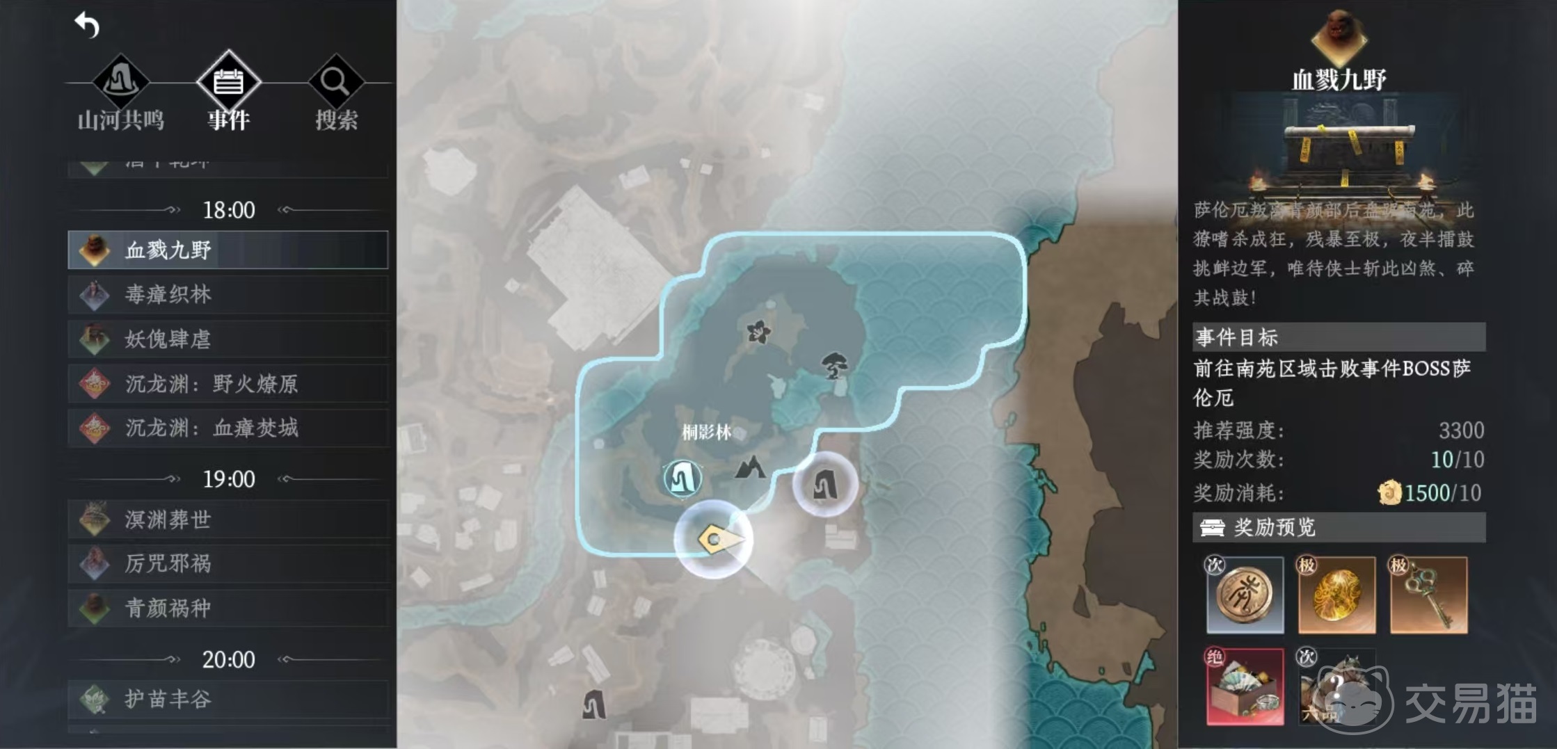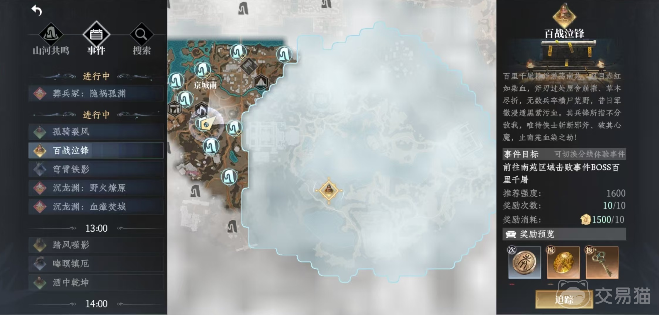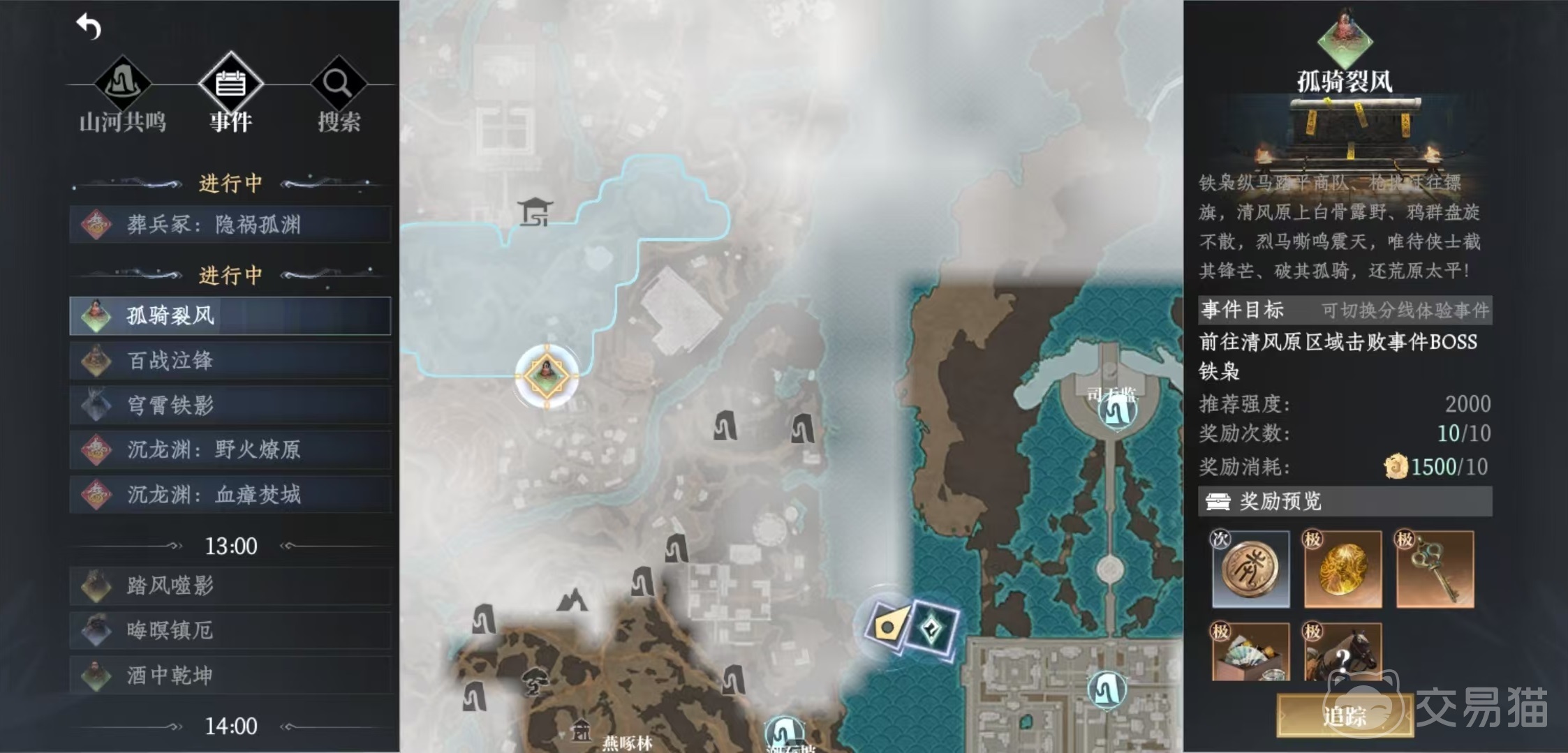 例如在每天12点开放的是孤骑裂风、百战泣锋、穹霄铁影。孤骑裂风是需要大家去清风原区域击败boss铁枭,百战泣锋是去南苑区域击败boss百里千屠,穹霄铁影是去桐影区击败BOSS铁羽王。到了13点,开放的世界首领就变成了踏风噬影、晦暝镇厄和酒中乾坤。踏风噬影是去南苑区域击败BOSS猲狙,晦暝镇厄是去平荫镇击败BOSS暗灵寿君,酒中乾坤是去怀阳林区击败BOSS酒公。