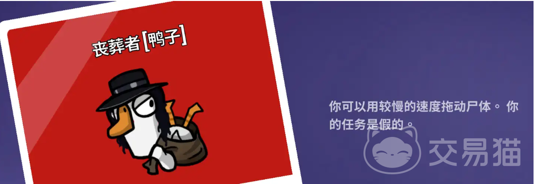 丧葬者在鸭子阵营中也被成为承办丧葬者,既然是丧葬者,那么它首先肯定是有着刀人的能力,刀完人以后,丧葬者可以用比较慢的速度去拖动尸体,丧葬者只要在快要靠近尸体的时候点击一下空格,这样就可以直接抓刀尸体了,然后在拖动着进行移动就可以挪动刀其他的地方了,不过在拖动尸体的时候,要注意拖动尸体移动的移动速度要比自己移动时的速度慢上很多。