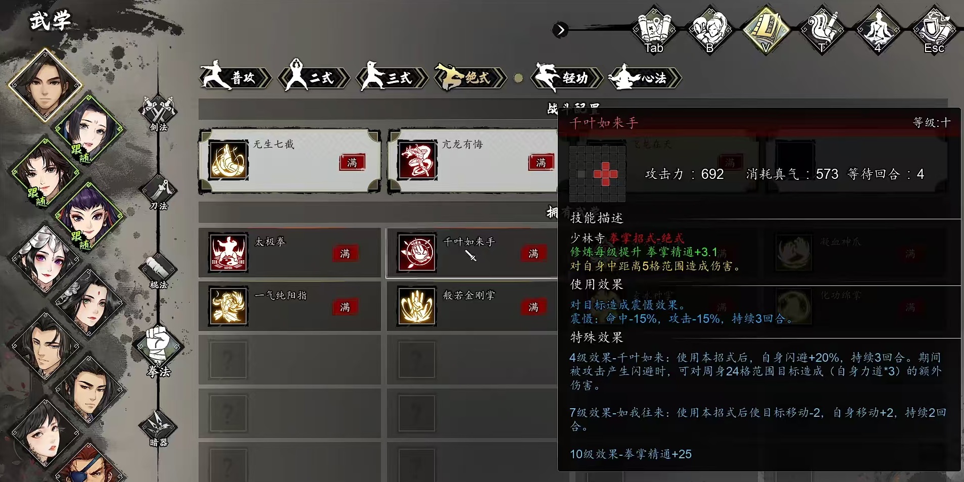 心法方面选择四象无极功和云相太极,也可以根据生存进行其他选择,例如太极神功等都可以,输出方面有需求就选择吸星、五灵或者是睡梦。除了这一套搭配之外,还可以选择另一套少林流派,选择千叶手、韦陀掌、罗汉拳和龙爪手,内功方面搭配上禅宗伏魔等相关心法,就可以组合成一套伤害较高的搭配方式。也可以走天魔拳流派搭配,核心招式选择大天魔手,无相劫指,配合上炎阳神掌和火云神掌,心法选择天魔六通等,后期换上清风云决,就可以流畅战斗了。