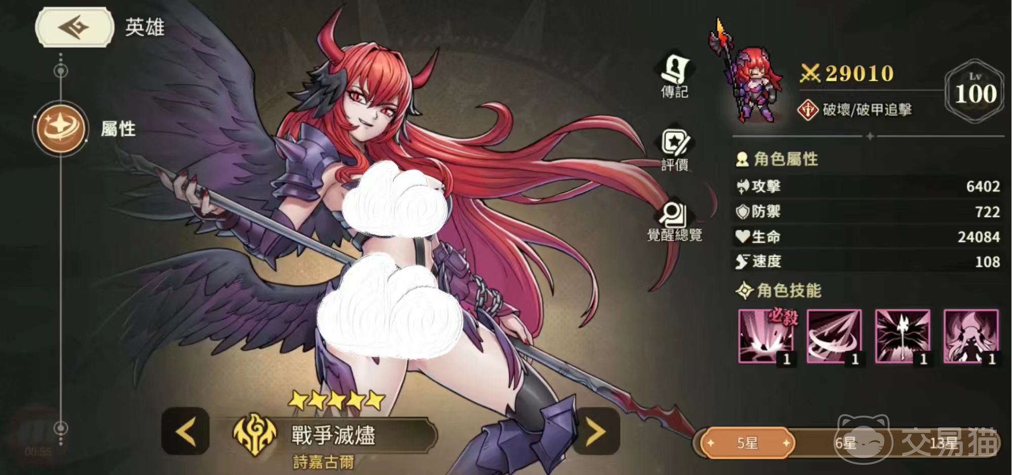 诗嘉古尔擅长打击前中排并削弱敌人防御。必杀技能对多个敌人造成高额物理伤害,并有几率附加【破甲】降低敌人防御,越打越脆。升星后伤害和【破甲】概率进一步提升,遇到守护类角色更是必中破防,还能为全队附加【战争之翼】提升减伤和抗暴,攻守兼备。作为破甲追击流的核心成员,非常适合打坦多的阵容。