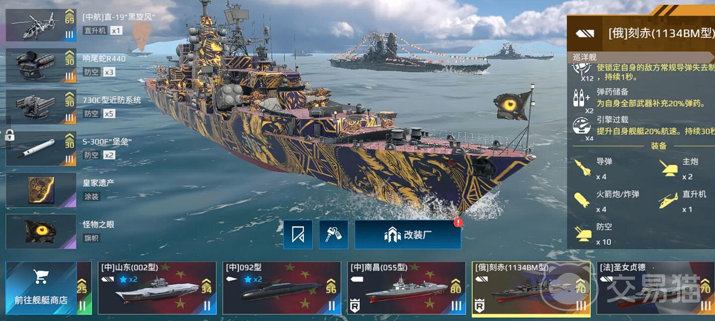 武器配置刻赤号拥有两组可替换的导弹插槽和两组火箭炮插槽。Kh-35导弹射程适中,适合打击中距离水面目标,而RBU-12000则能有效压制潜艇。防空系统方面,该舰搭载了S-300F“堡垒”远程防空导弹(锁定目标后自动发射)和M-22“飓风”中程防空系统,能有效拦截敌机与反舰导弹。舰后面的Ka-58“黑幽灵”直升机可执行侦察与反潜,提升战场感知能力。
