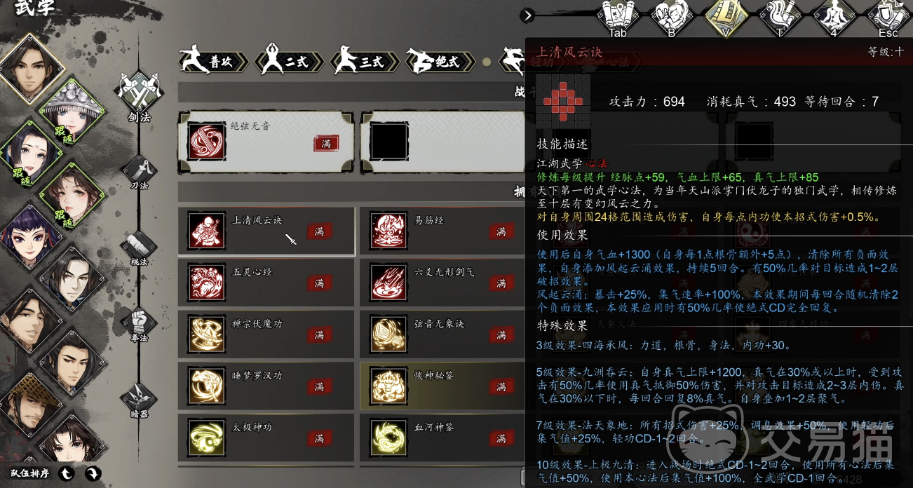 “上清风云诀”也与主线紧密相关,在洛村寻人任务就习得三层,品剑大会习得五层,能力可以逐步提升,这个技能能为自身气血 +1300,清除负面效果,添加风起云涌效果持续 5 回合。