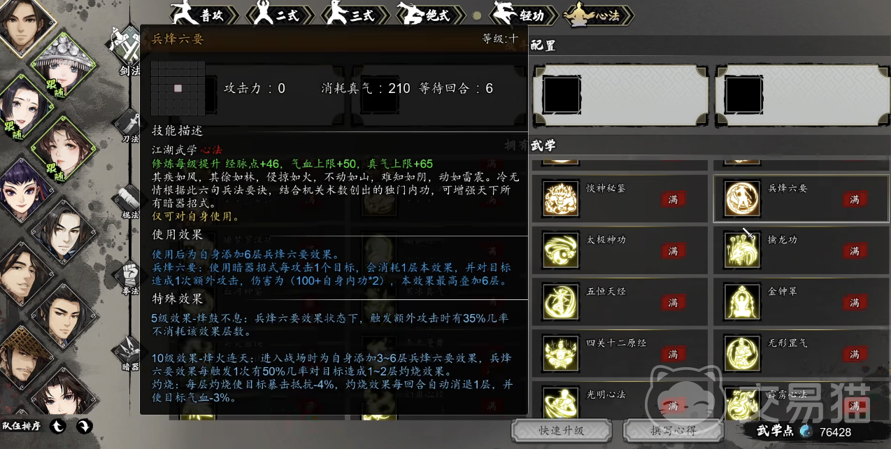前期通过主线不少心法可以无脑学。比如“风云诀-残”,在主线任务少林诡夜中可获得,使用后能为自身气血+1100,清除所有负面效果,添加风起云涌效果持续 4 回合。