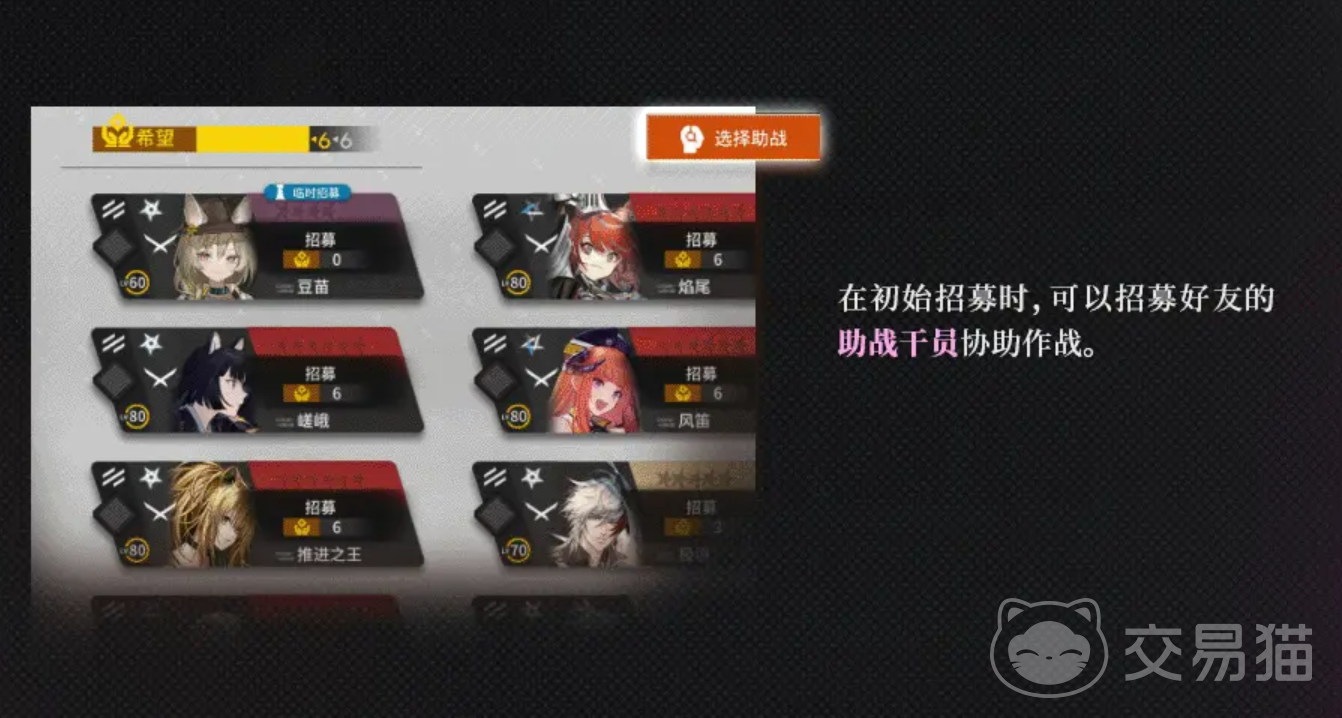 在初始招募时,可以招募好友的助战干员协助作战;还会出现随机的“临时招募”干员,这些干员的等级不受现有已拥有干员的影响,首次招募不消耗希望,在进阶后是最高等级;临时招募的情况下,还有机会遇到来自罗德岛的精英干员。