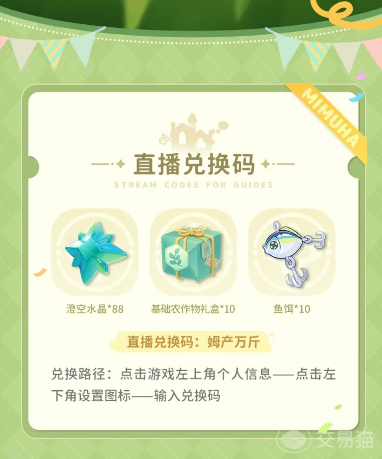 在米姆米姆哈这款游戏中。玩家可以在广阔大世界中穿梭邂逅一个又一个的奇妙世界,还有很多可爱的小伙伴。在浮空岛上可以开启钓鱼比赛,米姆赛跑等一系列活动,是一款非常休闲的游戏。根据目前官方在公测前瞻直播中所放出的消息,在公测中是有一个非常有效的兑换码:姆产万斤。这个兑换码是经过官方认证,所以肯定可以使用。