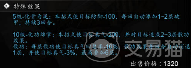而在技能达到10级时,化功绵掌的威力将进一步提升,进入“化功绵掌”状态。此时,技能将额外使目标的真气减少200点,并且会对目标造成2到3层的散功效果。散功效果每层都会降低目标的真气恢复速度,最高可叠加6层,且每回合自动消退1层。如此一来,敌人不仅会因为破甲而防御大幅下降,还会因为真气无法恢复而无法施展强力技能,使得化功绵掌成为一项极具战略价值的技能。