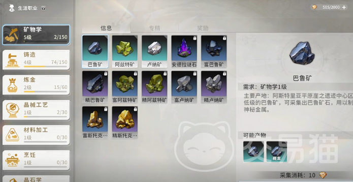 如果玩家想要获取巴鲁矿石、奴娜矿石、阿兹特矿石。可以直接进入到生活职业挑选矿物学,然后专精页面的这三个技能全部都会对应三种矿石。玩家可以先学习入门技能,接着就点击巴鲁矿。在找到矿石之后就可以开始干活,基本上每一次挖矿都会有10个精力的消耗,但是可以获得两个职业经验以及5个巴鲁矿。
