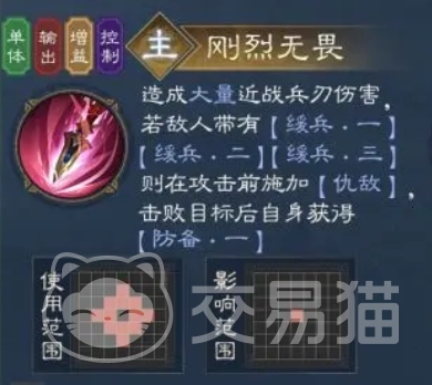 刚烈无畏作为主动技能,跟上面的勇战雪恨相比,它的用法更为丰富多样,当刚烈无畏技能发动时,夏侯惇会对敌人造成大量近战兵刃伤害,攻击之前,敌人身上如果是提前就有缓兵一、缓兵二之类的负面状态,那么此时的夏侯惇输出之前带来的增益就是会个敌人持续施加印记,而且在成功击败目标后,夏侯惇自身带来的除了上面缓兵系列之外,还有防备的效果,这里可以用的是防备一,这个效果能让夏侯惇的兵刃减免达到20%,这一系列的效果组合在一起让夏侯惇的行动更加全面。