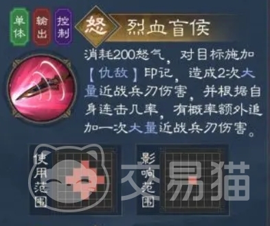 烈血盲侯作为夏侯惇的怒气技能,此技能在积攒足够怒气时,可以对目标施加仇敌印记,攻击的效果会受到他本身的连击几率影响,是有可能再次追加兵刃类型攻击的,所以说爆发力很高,而韧甲这类属性效果,是能够全面提升他的生命上限。