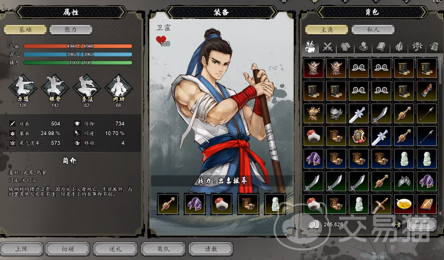 如果想要组建队伍的话,前期玩家可以选择卫霍、白锦和上官虹这样的角色,是因为这几个角色获取起来难度比较低,并且卫霍可以作为整个队伍的防护,防止对方进攻队伍里的其他成员,白锦有非常优秀的暗器流攻击能力,上官虹暴击能力会比较强一些,借助这几个角色,玩家能有非常优秀的表现,也可以选择搭配其他的成员,比如把冷无情、莫问和吕仙儿搭配在一起,就可以借助各自的能力,联合起来一起去攻击对手。