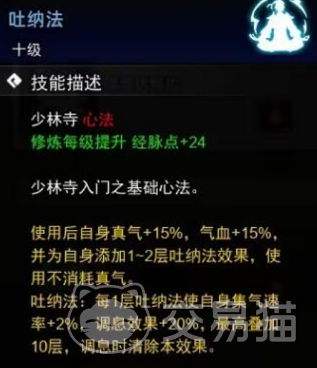 少林吐纳功堪称前期新手的福音,最主要它的获取难度还极低,各位只需完成少林寺支线任务就能轻松入手,但能带来的效果却很实用。在前期的很长一段时间里,它都可以成为玩家的得力助手。
