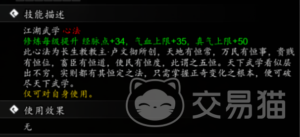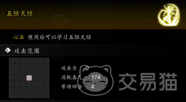 玩家们在战斗中施展五恒天经后,可在接下来的4个回合之内给自身添加三层buff,每一层可使自己的防御力提升5%,期间如果施展其他招式,可对敌方造成减防效果。当该技能升到5级之后,buff层数可额外添加一层,并且在持续期间如果施展二式和三式,则自身的伤害将会提升15%。升到10级之后,buff的层数可添加至5层,如果施展绝技,则蓝量消耗降低35%,如果使用轻功,则在下一回合中集气值可以提升15%。
