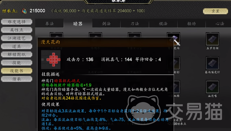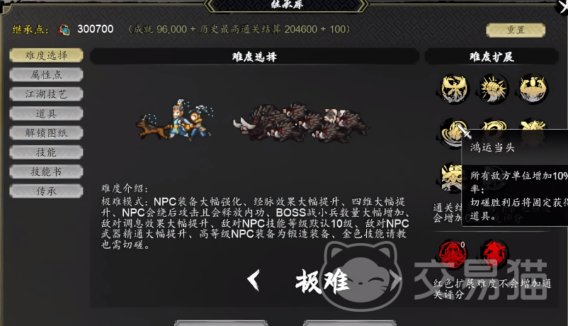 另外可以优先去选择心法,比如增加易筋经,这是能提升玩家输出能力的关键性因素,另外武功对于玩家来说也是非常重要的,可以去选择自己喜欢的流派,然后分配上2000左右的继承点,另外武器也可以进行少量的继承点分配,这样武器变得更加厉害之后,玩家前期的攻击能力也会变得更优秀。