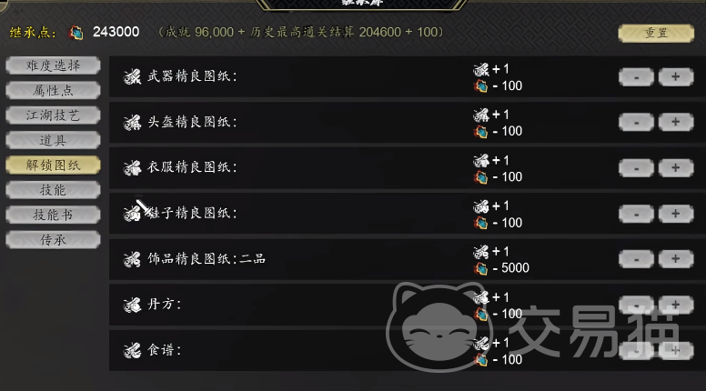 除了这些常规的继承点之外,还有很多玩家都比较容易忽略的图纸,可以对高级帽子进行继承点的分配,4瓶以上的帽子都可以提升回血效果,这样玩家也能拥有更强的战斗能力,如果还有其他的继承点就可以分配到经脉点上,也可以去选择各种武学,让角色可以拥有更优秀的战斗能力。