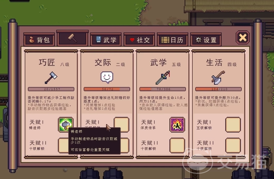 江城创业记还可以进行武术的学习,有多种武学技能供玩家们选择,学会后玩家们就可以轻松闯荡江湖,战斗系统也相对完善,只要合理操作就能通关困难关卡。游戏的地图也相对较大,地图数量相对丰富,玩家也可以雇佣古人为你打工,对产业进行进一步扩张,作为一个自由度高的游戏,玩家甚至可以学习厨艺,可以采集、制药,还有对武术的学习,江城创业记的休闲玩法非常丰富。