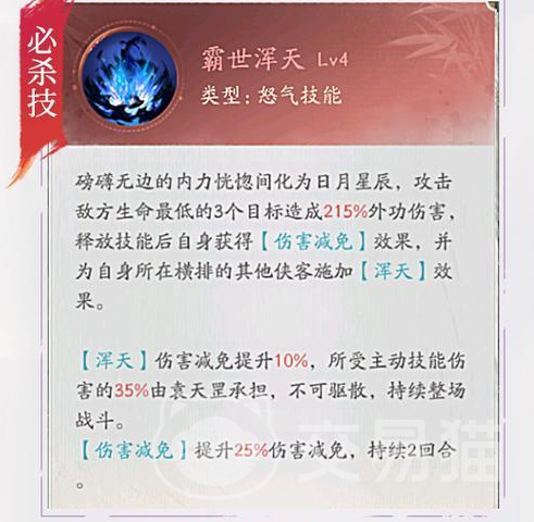 袁天罡的必杀技“霸世浑天”,从名字上就能感受到一股强烈的霸气,想象一下,那个给敌人带来绝望的瞬间!他会攻击敌方生命值最低的三个目标,造成215%外功伤害。可是,真正让人惊叹的,是技能释放的附加效果——袁天罡能获得伤害减免效果,还为自己前排的其他侠客施加“浑天”效果。这种效果的关键是让敌人无法轻易突破你前排的防线,它可以减免10%的伤害,并且每次敌方的主动技攻击,35%的伤害将由袁天罡承担。这种效果不仅不容驱散,还能持续整个战斗,并在两回合内增加25%的伤害减免,敌人无论怎么攻击都得考虑一下,自己能否穿透这座钢铁长城。