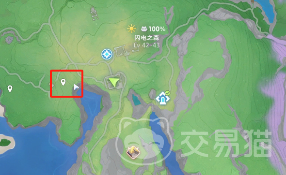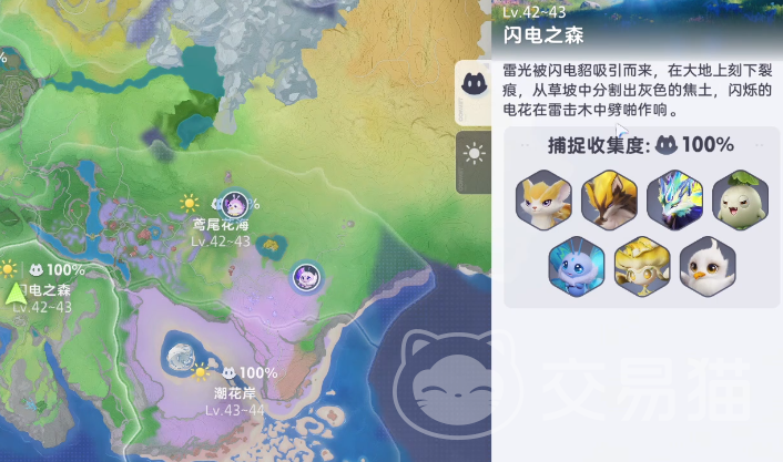 闪电之森在整个地图的下方,玩家可以看到在临近海域的地方有大片的绿色平原,这里就是闪电之森,想要来到这里捕捉玩家需要让自己的等级达到42级以上,区域总共会有七种不同的宠物,每一种都会有不同的位置,首先可以去闪电之森的上方区域,在这里玩家可以捕捉到走调草,这个宠物的外观造型非常像一个绿色的萝卜头上还会顶着五5片叶子,在叶子中央会有紫色的小花,虽然远看也是绿色的,但是和整体的草地场景还是有色差的,玩家可以在这个区域里仔细进行搜索。