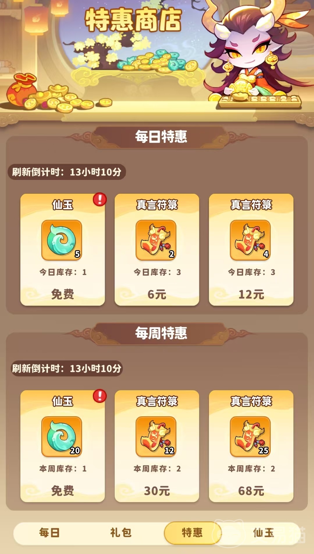 这款游戏现在刚刚开服,所以里面有着非常多的活动,这对于氪金玩家来说是拿资源的好地方。先来看一下最常规的内容。首先是首充一定要拿下,赠送的魔宠是前期推图的关键,然后是特惠商店,特惠商店中除了免费获得的资源之外,法宝乾坤袋、珍品宝箱钥匙的每月特惠购买性价比非常高,其次是每周特惠,每日特惠,建议氪金玩家也都拿下。然后将战令打开,月卡方面分为大月卡和小月卡,这两个月卡也都需要购买,一个月可以获得大量仙玉和多种特权,快速提升战力。