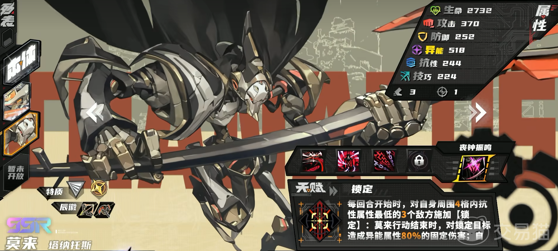莫来是远程单体输出,天赋能在每回合开始时,对自身4格范围内抗性最低的3位敌人施加锁定,每次攻击锁定的敌人会造成额外伤害,还拥有一定控制技可以让敌人不能使用技能或移动,机甲可以让敌人的抗性降低,从而更容易遭受负面效果。