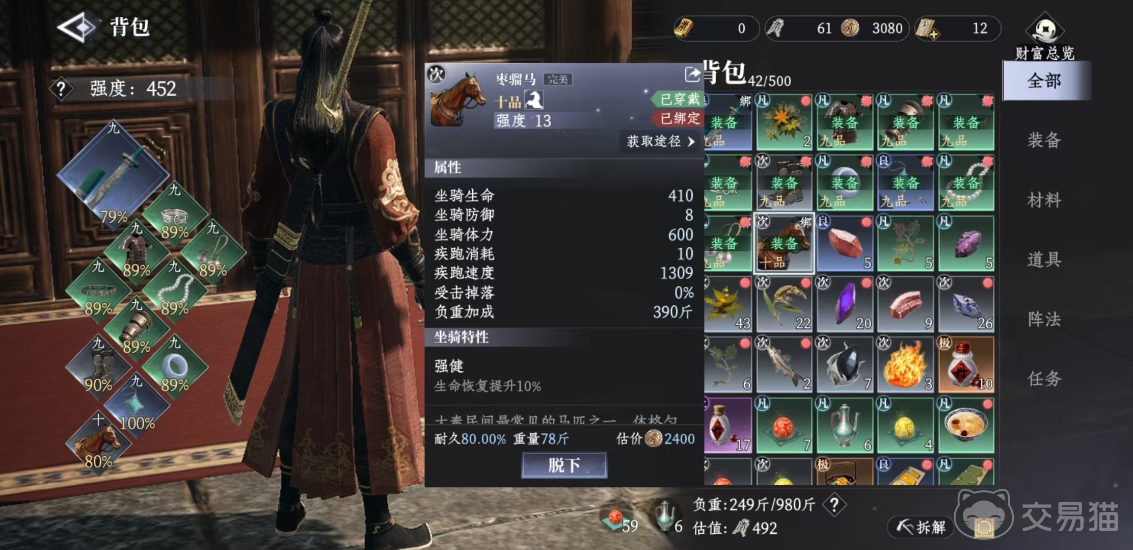 游戏中的坐骑有着不同的属性和特性,属性包括生命、防御、体力、疾跑消耗、疾跑速度、负重加成等。坐骑的品级越高,带来的属性加成和特性也就越出色,这也是和战斗有着密切关系的一项。游戏中的坐骑也分为不同的品级,最低的是十品坐骑枣骝马,这是在前期跟随主线,很快就可以给大家的一个普通坐骑,只能起到基础的作用。枣骝马的特性是强健,生命恢复提升10%。