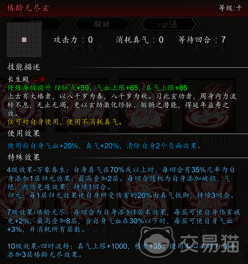 道家庄子《逍遥游》中有云“上古有大椿者,以八千岁为春,八千岁为秋”可能说的就是逸剑风云决椿龄无尽玄这门心法。逸剑风云决椿龄无尽玄这门心法练习可以帮助游戏角色提高持久的战斗力和续航能力,这也正从侧面验证了逍遥游里的那句古诗词,学习该心法生命力极其顽强。