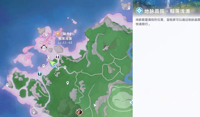 鲸落浅滩在整个地图的左上角区域,在这个区域中陆地面积比较小,大部分都是海滩区域,所以在这里能收集到的都是一些水系类型的宠物,首先,玩家可以通过地图上的地图晶簇鲸落浅滩的传送点,传送到当前的位置,到达这个点位之后,玩家可以向西北方向行走,不远处的石头后面就可以看到羞羞獭和泡泡獭,靠近对方之后通过战斗就能顺利收集,接着玩家可以继续向北,在这里能遇到这个区域的头目胖胖獭,要击败这个boss,然后能用大师球进行捕捉。