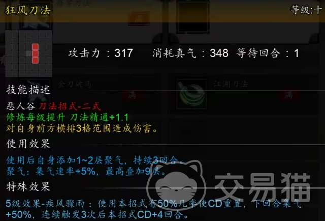 “狂风刀法”能在对前方横排3格造成范围输出后,给自身添加1到2层的聚气3回合,聚气能让集气速率加5%,该招式修炼到5级可触发“疾风骤雨”,能在使用本招时有50%的概率让冷却重置,下回合集气加50%。