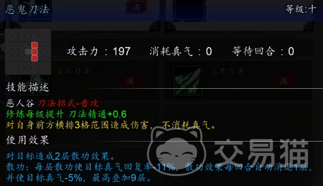 恶人谷刀法的普攻“恶鬼刀法”能对横排3格范围内的敌人造成伤害,不消耗真气,且会对目标造成2层散功,散功会让目标的真气回复率减少11%,每回合自动消散1层,并使得目标真气减少5%,将“恶鬼刀法”修炼到5级可让所有恶人谷刀法的招式伤害提升7%。