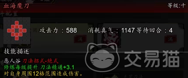 他的绝招会对周围12格范围的敌人造成输出,对目标造成3层流血,为自身添加3层血海魔刀,血海魔刀可以让恶人谷所有刀法伤害加5%,每回合有50%的几率消退1层,升到4级可在使用所有恶人谷刀法攻击时,为自身吸取伤害15%的气血。