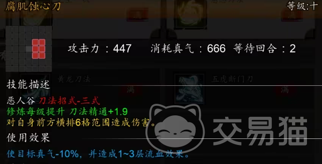 “腐肌蚀心刀”会对横排6格的敌人造成范围伤害,使得目标真气减少10%,并造成1到3层流血效果,升到5级会让此招额外对敌人造成3层散功,并且所有系列刀法在使用时有30%概率对目标造成1到2层破甲。