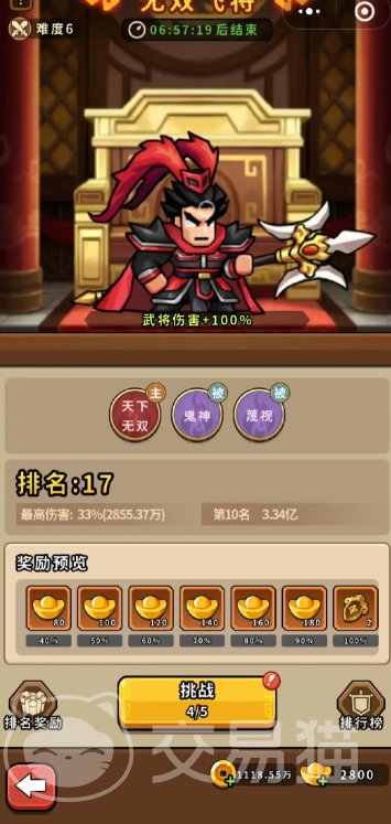 固然在无双神将挑战期间,玩家要尽可能的造成更多爆发伤害,同时位列排名前榜。