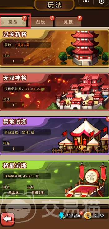 游戏内有四大核心的挑战模式,它们分别是:过关斩将、无双神将、禁地试炼、将心试炼。