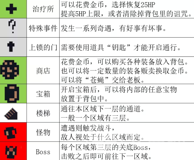 下图的这个图标代表的是上锁的门,大家需要使用道具“钥匙”才能继续通行,一个像钟表的圆圈图标代表商店,大家在此处花费金币,可以购买各种装备放入背包,也可以将一定数量的装备贩卖换取金币,或者把苍蝇交给老板。