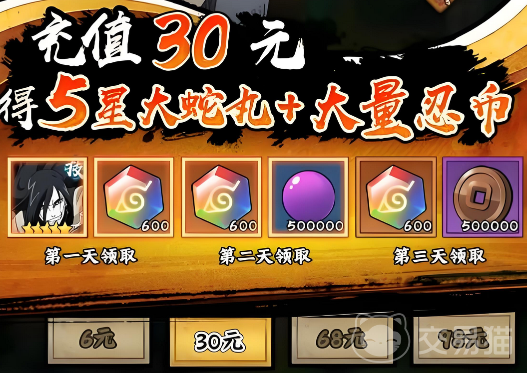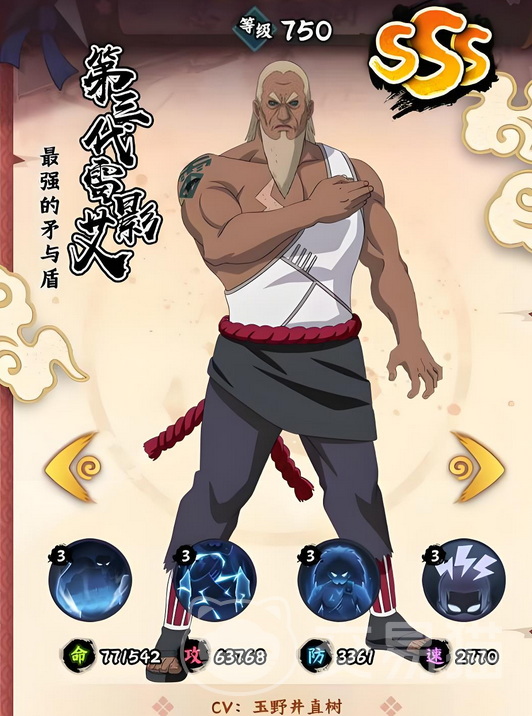 在游戏中通过首充就可以直接获得大蛇丸,这也是很多玩家都会使用这个忍者的重要原因。另一个原因就是自身的技能非常强悍,无论是主动还是被动都是如此。大蛇丸的主动技能三重罗生门,对敌方全体造成100%攻击力的伤害,每击中一个敌方角色,都有50%的几率,给大蛇丸附加一层抵御效果。每带有一层抵御,可提升5%的抗暴率,在受到必杀技攻击时,会反弹部分伤害此,效果最多叠加到5层,每层持续4回合。