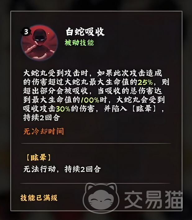被动技能咒印术,在大蛇丸受到攻击时,有50%的几率给对方附加一层咒印。在大蛇丸即将阵亡时,会选择当前携带咒印最高的一名角色,按照大蛇丸自身血量的30%造成伤害,并以30%的血量再生,将场上的所有咒印效果清除。对方每有一层咒印,会提升2%的攻击,降低5%防御,最多叠加10层。这样被动效果叠加起来之后,对方的防御将会变得非常脆弱,很容易就被我方集火秒掉。