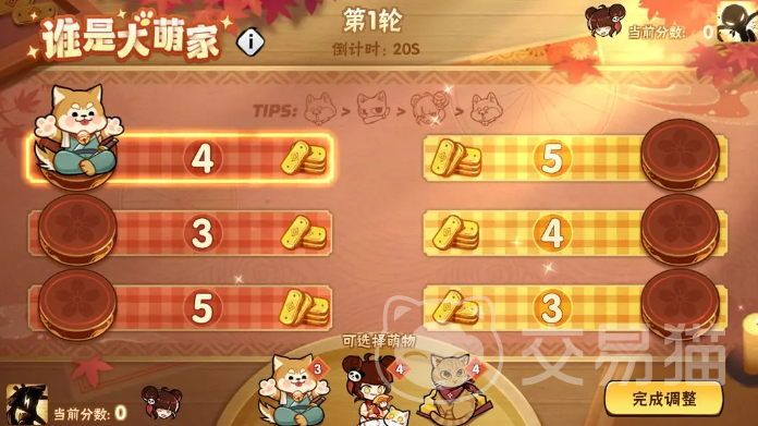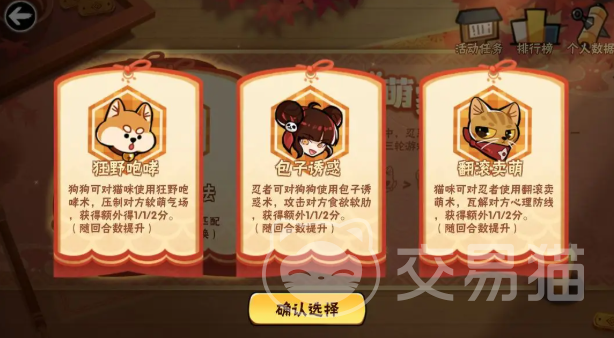 变换时间结束后,会公布双方的战线分布情况,在这个时候大家就需要给每条战线选择一个萌物,萌物之间有着相应的克制关系,分别是狗克猫,猫克忍者,忍者克狗,当己方为狗狗时,分数会归零并夺取对方分数,若敌方时忍者夺取会失败,当己方是猫时,对方只要不是狗狗就能获得翻倍的分数,当己方是忍者时,可以保护分数不被夺取。
