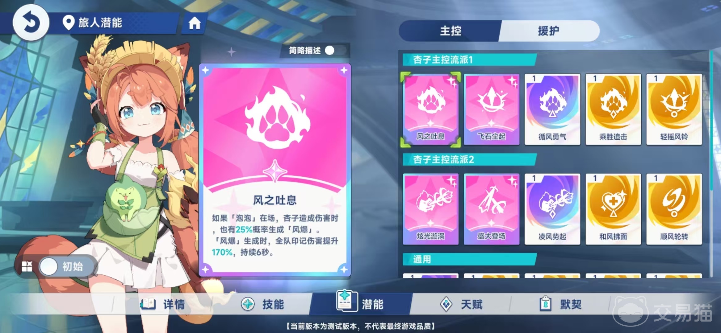 杏子这个角色一般都是和风系的其他角色一起组成阵容,而且自身并不会作为主控,而是作为援护登场,因为只要用好风墙就足够了,风墙才是杏子的真正核心所在。不仅可以阻挡大量伤害,在杏子退场之后,风墙也能在场中持续生效。这样一来,这个辅助角色就可以在全场发挥出很重要的作用。潜能方面,建议选择风之吐息、飞石尘起、循风勇气、乘胜追击、轻摇风铃等。例如风之吐息,泡泡在场的时候就能使得杏子的伤害有几率产生风爆,以及在风爆炸时提升全队的印记伤害等。